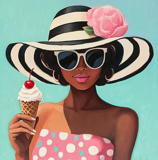 Classy Living"Ice Cream on Pink" is a vibrant hand-painted gloss canvas that captures a stylish woman enjoying an ice cream cone against a playful pink backdrop...