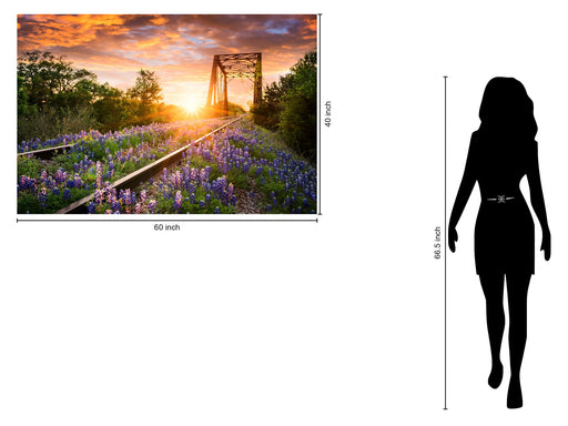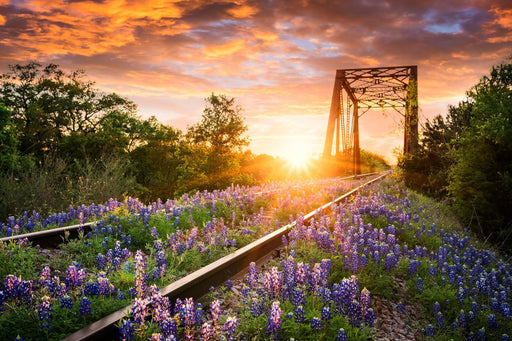 Classy LivingBluebonnet Rails captures a breathtaking scene where vibrant bluebonnet flowers bloom abundantly along rustic railroad tracks, leading toward a glo...