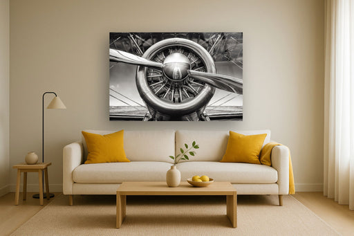 Classy Living“Propeller II” captures the intricate beauty of vintage aviation with a striking close-up photograph of a polished aircraft propeller and engine. P...
