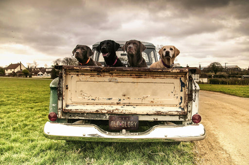 Classy Living"Old Glory" captures a nostalgic moment with four dogs sitting in the bed of a vintage truck, set against a rustic countryside backdrop. Printed on...