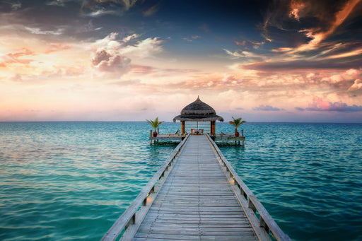 Classy LivingStep into serenity with "Ocean Hut," a captivating photographic wall art piece printed on durable tempered glass. This contemporary artwork feature...