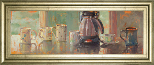 Classy LivingStep into a warm, inviting kitchen moment with this charming artwork that captures a collection of coffee mugs and a classic coffee pot resting on ...