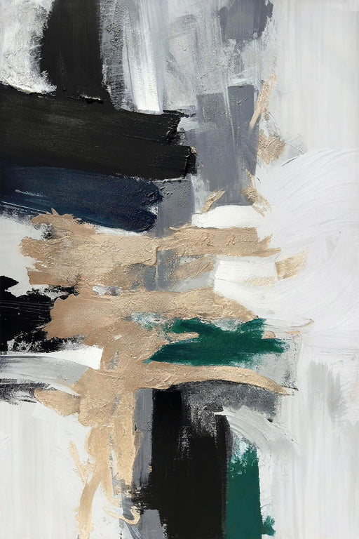 Classy LivingBold black, green, gold, and grey textured brush strokes create a modern abstract masterpiece—perfect for elegant, contemporary spaces.Product Feat...
