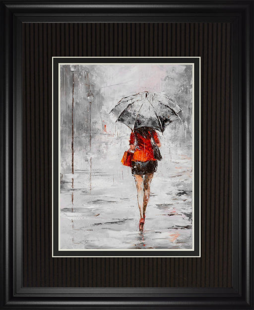 Classy LivingStep into the quiet elegance of a rainy cityscape with this evocative framed wall art. A solitary figure, clad in vibrant red, walks gracefully ben...