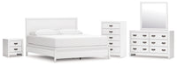 Details B427B9: Includes California king panel headboard, footboard, rails and slats, Made with hardwood solids, okoume veneer and MDF substrates, White finish, Foundation/box spring required, sold separately, Mattress available, sold separately, Assembly required, B427B1: Includes dresser and mirror, Made with hardwood solids, okoume veneer and MDF substrates, White finish, 6 drawers with dovetail construction and metal center guides, Hardware with dark finish, Drawer interiors are lined with a wood grain laminate for a clean, finished look, Mirror attaches to back of dresser, B427-46: Made with hardwood solids, okoume veneer and MDF substrates, White finish, 5 drawers with dovetail construction and metal center guides, Hardware with dark finish, Drawer interiors are lined with a wood grain laminate for a clean, finished look, B427-92: Made with hardwood solids, okoume veneer and MDF substrates, White finish, 2 drawers with dovetail construction and metal center guides, Hardware with dark finish, Drawer interiors are lined with a clean wood grain laminate for a clean, finished look,