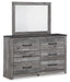 Details B1290B4: Includes king panel headboard/footboard and rails, Made with engineered wood (MDF/particleboard/plywood) and decorative laminate for the right balance of affordability and durability, Smoky gray finish over replicated oak grain with authentic touch, Decorative laminate replicates natural or man-made material surfaces with consistent color, pattern and texture, Foundation/box spring required, sold separately, Mattress available, sold separately, Assembly required, Bed is compatible with an adjustable base, B1290B1: Includes dresser and mirror, Made with engineered wood (MDF/particleboard/plywood) and decorative laminate for the right balance of affordability and durability, Two-tone look: smoky gray replicated oak grain accented with rustic charcoal finish; replicated oak grain with authentic touch, Charcoal finish over replicated oak grain with authentic touch, Decorative laminate replicates natural or man-made material surfaces with consistent color, pattern and texture, Large-scaled handles in a dark hue, 6 smooth-gliding drawers with dovetail construction, Drawer interiors are lined with a faux linen laminate for a clean, finished look, Framed front and pilasters, Mirror attaches to back of dresser; can also be mounted on wall horizontally or vertically, Safety is a top priority, clothing storage units are designed to meet the most current standard for stability, ASTM F 2057 (ASTM International), Drawers extend out to accommodate maximum access to drawer interior while maintaining safety, Assembly required,