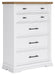 Details B844B4: Includes panel headboard, storage footboard, rails and roll slats, Footboard made with hardwood solids, MDF substrates and butcher block oak veneer, Headboard and rails made with hardwood solids and MDF substrates, White finish, Headboard with inset black metal barn sash, 2 drawers in footboard with fully finished interior, dovetail construction and ball-bearing side glides, Pulls with matte black finish, Bed does not require a foundation/box spring, Mattress available, sold separately, Assembly required, B844B1: Includes dresser and mirror, Made with hardwood solids, MDF substrates and butcher block oak veneer, Dresser with 2-tone finish (white finish; butcher block oak veneer with natural finish), Pulls with matte black finish, 10 spacious drawers with fully finished interiors (top drawers felt lined), dovetail construction and ball-bearing side glides , Drawers with inset picture fronts, Mirror attaches to back of dresser, B844-46: Made with hardwood solids, MDF substrates and butcher block oak veneer, 2-tone finish (white finish; butcher block oak veneer with natural finish), Pulls with matte black finish, 5 spacious drawers with fully finished interiors (top drawers felt lined), dovetail construction and ball-bearing side glides, Drawers with inset picture frame fronts, B844-93: Made with hardwood solids, MDF substrates and butcher block oak veneer, 2-tone finish (white finish; butcher block oak veneer with natural finish), Pulls with matte black finish, 3 spacious drawers with fully finished interiors (top drawers felt lined), dovetail construction and ball-bearing side glides, 110V power supply with dual USB charging ports, Power cord included; UL Listed, Drawers with inset picture frame fronts,