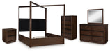 Details PCB857B2: Includes canopy, upholstered poster headboard, footboard, rails, posts and slats, Made with hardwood solids, mango wood veneer and MDF substrates , Side rails feature laminated solid hardwood slat support rails (or LVL) with glued and screwed blocking for added strength, Complex, rich dark brown finish, Foam headboard cushion with polyester upholstery , Measure room, including ceiling height, to ensure bed clears fans and light fixtures, Foundation/box spring required, sold separately , Mattress available, sold separately , USB-A and USB-C charging ports, Power cord included; UL Listed, Assembly required, PCB857B1: Made with hardwood solids, mango wood veneer and MDF substrates , Complex, rich dark brown finish, Full-length metal rail pulls with matte black finish, 6 smooth-gliding drawers with fully finished interiors, dovetail construction and heavy-duty ball-bearing side glides (top drawers felt lined), Mirror attaches to back of dresser, Soft rounded pilasters, Raised plinth base, PCB857-46: Made with hardwood solids, mango wood veneer and MDF substrates, Complex, rich dark brown finish, Metal rail pulls with matte black finish, 5 smooth-gliding drawers with fully finished interiors, dovetail construction and heavy-duty ball-bearing side glides (top drawer felt lined), Soft rounded pilasters, Raised plinth base, PCB857-92: Made with hardwood solids, mango wood veneer and MDF substrates, Complex, rich dark brown finish, Metal rail pulls with matte black finish, 2 smooth-gliding drawers with fully finished interiors, dovetail construction and heavy-duty ball-bearing side glides (top drawer felt lined), Soft rounded pilasters, Raised plinth base,