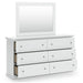 | Details | B139B43: Includes panel headboard/footboard and rails, Made with engineered wood (MDF/particleboard/plywood) and decorative laminate for the right balance of affordability and durability, Replicated solid white paint, Decorative laminate replicates natural or man-made material surfaces with consistent color, pattern and texture, Foundation/box spring required, sold separately, Mattress available, sold separately, Assembly required, B139B40: Includes dresser and mirror, Made of engineered wood (MDF/particleboard), Knobs with pewter-tone finish, Scalloped moulding, 6 smooth-operating drawers, Includes tipover restraint device, Mirror attaches to back of dresser; can also be mounted on wall horizontally or vertically, Safety is a top priority, clothing storage units are designed to meet the most current standard for stability, ASTM F 2057 (ASTM International), Drawers extend out to accommodate maximum access to drawer interior while maintaining safety, | |