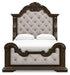 Details B947B2: Includes upholstered panel headboard, upholstered panel footboard and panel rails, Made with hardwood solids, oak and ash swirl veneers, MDF substrates and cast resin components, Dark brown finish, Polyester upholstery with button tufting, Foundation/box spring required, sold separately, Mattress available, sold separately, Assembly required, B947B1: Includes dresser and mirror, Made with hardwood solids, oak and ash swirl veneers, MDF substrates and cast resin components, Dark brown finish, 6 smooth-gliding drawers with dovetail construction (top drawer felt lined), Drawer pulls with antiqued goldtone finish, Mirror attaches to back of dresser, B947-46: Made with hardwood solids, oak and ash swirl veneers, MDF substrates and cast resin components, Dark brown finish, 5 smooth-gliding drawers with dovetail construction (top drawer felt lined), Drawer pulls with antiqued goldtone finish, B947-93: Made with hardwood solids, oak and ash swirl veneers, MDF substrates and cast resin components, Dark brown finish, 2 smooth-gliding drawers with dovetail construction (top drawer felt lined), Pull-out tray behind bottom drawer, Drawer pulls with antiqued goldtone finish, 110V power supply with dual USB charging ports, Power cord included; UL Listed,