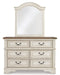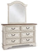 Elevating the art of traditional cottage styling, this dresser and mirror set is your dream bedroom retreat realized. This brilliantly crafted bedroom ensemble wows with dramatic scalloped details and an antiqued two-tone aesthetic, blending a chipped white with a distressed wood finished top for added charm. Framed drawer fronts and decorative corbels add refinement, while bail pulls in a dark bronze-tone finish lend a classic touch.