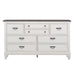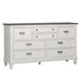 The two-toned wire brushed white finish with charcoal top adds a taste of vintage, allowing this piece to work from the mountains to an industrial loft. The charcoal top is accented by planks while the white base is highlighted by bead molding and antique pewter hardware. Crafted of rubberwood solids with cathedral white oak tops, this piece features fully stained interior drawers, full extension drawer glides for easy access to storage, felt lined top drawers, and is anchored by tapered feet. Style uncompromised with storage abound, enjoy the ample drawer storage, each equipped with bottom case dust proofing.