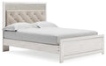 The epitome of fashion-forward design, this queen panel platform bed is a beautiful blend of comfort and luxury. Shiny chrome-tone accents, a pearlized finish and button-tufted upholstery bring a glam touch to the richly rustic appearance. Remote-controlled LED lighting adds style and modern convenience to your restful retreat.