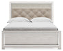 | Details | Includes queen upholstered panel headboard, footboard, platform rails and roll slats, Made with engineered wood (MDF/particleboard) and decorative laminate, Light finish with subtle pearl effect over replicated cedar grain with authentic touch, Gray polyester upholstery with faux crystal button tufting, Glitter panel accent, Faceted chrome-tone accents, LED light strip with remote-controlled color and brightness options, Included remote holder discreetly keeps light remote accessible, Power cord included; UL Listed, Mattress available, sold separately, Bed does not require a foundation/box spring, Assembly required, Bed is compatible with an adjustable base | |