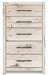 | Details | Made with engineered wood (MDF/particleboard/plywood) and decorative laminate for the right balance of affordability and durability, Rustic white finish over replicated reclaimed oak grain with authentic touch, Decorative laminate replicates natural or man-made material surfaces with consistent color, pattern and texture, Handles with dark pewter-tone finish, 5 smooth-gliding drawers, Drawer interiors are lined with a faux linen laminate for a clean, finished look, Framed front and pilasters, Safety is a top priority, clothing storage units are designed to meet the most current standard for stability, ASTM F 2057 (ASTM International), Drawers extend out to accommodate maximum access to drawer interior while maintaining safety, Minor assembly required | |