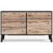 The perfect marriage of simple and contemporary style, this dresser is a charming addition to your home. It features an expressive two-tone look, with a dark charcoal finish over replicated oak grain with an authentic touch and a replicated sugarberry wood grain. Ball-bearing glides offer smooth opening and closing of the drawers, while matte black knobs and splay legs add a finishing touch.