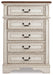Elevating the art of traditional cottage styling, this chest of drawers is your dream bedroom retreat realized. Antiqued two-tone aesthetic blends a chipped white with a distressed wood finished top for added charm. Framed drawer fronts and decorative corbels add refinement, while bail pulls in a dark bronze-tone finish lend a classic touch.