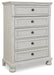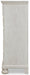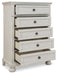 Elegant, timeless furnishings take your bedroom to the next level. Nothing does that better than this chest of drawers. The antiqued white finish with a wonderful grain texture radiates sophistication, while dark bronze-tone knobs add an ornate touch. Felt finishing in the upper drawers rounds out this tasteful piece.