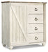 | Details | Made of engineered wood (MDF/particleboard) and decorative laminate, Whitewash replicated worn through paint with authentic touch, Replicated wood grained block pattern with authentic touch, Antiqued brass-tone ring-pull hardware, Slider door revealing open storage with 2 adjustable shelves, 4 smooth-gliding drawers, Safety is a top priority, clothing storage units are designed to meet the most current standard for stability, ASTM F 2057 (ASTM International), Drawers extend out to accommodate maximum access to drawer interior while maintaining safety, Assembly required | |