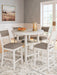 | Details | Includes counter height dining table and 4 counter height bar stools, Table made with rubberwood solids, mindi veneer and MDF substrates, Bar stool made with solid wood frame and engineered wood, White finish, Light gray textured polyester upholstery, Foam seat and back cushions, Backrest with fretwork accent, Bar stool with adjustable levelers; footrest for added support, Table includes 2 display shelves, Seats up to 4, Tapered legs, Assembly required | |