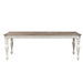 Create a grand gathering with the Magnolia Manor optional table set, consisting of splat back side chairs and a rectangular table. Crafted of poplar solids with cathedral white oak veneer, this kit features an antique white finish with heavy chipping and a weathered brown top with whitewash. The table offers a fancy face top, canted corners, two 18" leaves to easily accommodate guests or a large family and is anchored by faceted turned legs. The chairs feature the perfect blend of European design with a saddle shaped seat, dog bone accents on the splat back, nylon chair glides to protect your flooring, and beautifully faceted turned legs. Warm antique finishes and artistic distressing along with grand scale create a piece to be passed to generations.