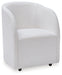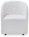 Inspired by art deco design, this fully upholstered dining chair makes a lasting impression in a simply stunning way. Its magnificent curved silhouette is enhanced with a neutral boucle upholstery that’s so pleasing to the palate. This is the piece you’ve been looking for to elevate your contemporary decor whether you’re dining, listening to your latest playlist or binge-watching with friends. Plus, it’s set on casters so it’s easy to move around.