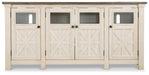 Whether your style is farmhouse fresh, shabby chic or country cottage, you’ll find this extra large TV stand perfectly in tune. Its two-tone, gently distressed finish pairs weathered oak with antiqued white for that much more quaint character. Charming elements include crossbuck adorned cabinets with glass inlays for peek-through flair. Ample adjustable shelving and cutouts for wire management nicely accommodate your media needs.