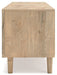Clean-lined and contemporary—but far from stark—this TV stand is a fresh style awakening. Pairing a light finish with replicated oak grain and textured beige cane details, its mixed materials bring a naturally versatile vibe to your favorite spot for binge-watching or gaming. Sleek, simple hardware plays perfectly with the modern aesthetic. And prepare to have your mind blown by the vast universe of storage possibilities within the spacious drawers and open shelving.