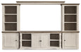 | Details | Includes TV stand, 2 pier cabinets and bridge, Made of pine wood, pine veneer and engineered wood , Two-tone distressed finish: weathered gray top; vintage white base, TV stand with 2-door cabinet with single-shelf storage and 2 open shelves, Each pier cabinet with 2 fixed shelves and cabinet with single-shelf storage, Aged iron-color hardware, Cutouts for wire management, Assembly required | |