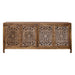 Marisol accent TV console gives you that Boho chic feel that is so popular today. Boho is a mix of colors, styles, and materials to create a carefree causal comfortable space. Crafted of solid mango with a soft finish. Features three artisan hand craved doors in a floral pattern, one fixed shelf behind each door, shaped block legs with antique brass knob hardware. Perfect as a TV console.