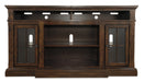 The beauty of this TV stand will immediately engage you. The slight breakfront shape is a rare find and an ideal fit among traditional and eclectic tastes. Soft black undertones highlight the warm finish. Multiple cubbies and glass-door enclosed shelves organize your audio/video components and plenty of extras. Sold separately, an electric fireplace fits neatly in the center cubby.