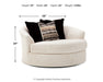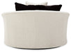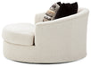 Let it snow. Doubling your pleasure with a spacious seating area with room for two—or just you—this oversized round swivel chair in a snow-tone neutral invites you to stretch your style in an easy-elegant way. Whether your aesthetic is urban hip or suburban chic, this posh swivel chair is sure to look and feel right at home. Wrapped in a chunky heavyweight chenille fabric with a delightful touch, this fashion-forward chair includes designer pillows for a brilliant pop of color and texture.