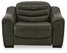 For those seeking to curate a living room retreat with superior comfort and a contemporary aesthetic, this sleekly designed power recliner will become your favorite source of at-home serenity. Rest on expertly matched leather and faux leather upholstery, and use the one-touch power control to recline and adjust the headrest with ease. As you recharge after a long day, your devices can too with USB charging. This recliner is visually enticing in a luxe dark gray, with slope track arms and stitched detailing on the back to enhance its modern appeal.