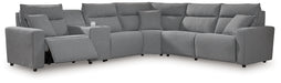 Details Includes 6 modular pieces: left-arm facing power recliner, power armless recliner, armless chair, console, wedge and right-arm facing power recliner, "Left-arm" and "right-arm" describe the position of the arm when you face the piece, Versatile modular pieces fit together in a variety of configurations, One-touch power control with adjustable positions, Easy View™ adjustable headrest and zero-draw USB port, Zero-draw technology only consumes power when the USB receptacle is in use, Corner-blocked frame with metal reinforced seat, Attached seat and back cushions; high-quality foam cushions wrapped in poly fiber, Polyester upholstery; Next-Gen Nuvella™ is a family-friendly fabric that is soft, easy to clean, stain-resistant and durable, Clean fabric with mild soap and water, let air dry; for stubborn stains, use a solution of 4 oz. bleach to 28 oz. water, Throw pillows with easy-to-remove zippered covers for machine washing; pillows with soft polyfill, Console with plexiglass top and 2 cup holders, Zero wall recliner design requires minimal space between wall and chair back, Power cord included; UL Listed