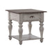 Create a relaxed interior look that works for coastal styles, country, and cottage interiors with the Ocean Isle drawer end table. Crafted of rubberwood solids and New Zealand pine veneers, this piece features a slate finish with weathered pine, one fully stained drawer with complete dust proofing to protect contents, wooden drawer glides, and is accented by satin nickel cup hardware. Users can enjoy the convenience of added storage with the bottom shelf, perfect for storing magazines, board games, or extra throw blankets.