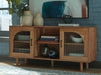 | Details | Made with solid acacia wood, Back made with acacia veneer and engineered wood substrate, Natural finish, Metal door pulls with black finish, 2 doors with half-arch patterns and fluted glass inserts, 3 removable shelves, Openings in back for electronics, Assembly required | |