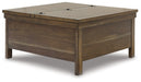 This lift-top coffee table might appear simple at first sight. But a closer look reveals beauty in the details. With a plank-effect tabletop, a tobacco brown finish and antiqued bronze-tone hardware, it’s simply beaming with charm. A handy lift top makes it easier than ever to eat, work or play from the comfort of your sofa. Crafted for form and function, this table will serve you well for years to come.