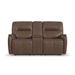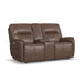 Add sleek sophistication to your living spaces with the Wilson power reclining loveseat with console. Its thin profile design and subtle curves lend a timeless, elevated style, while a handy console offers convenient storage. The pad-over arms, waterfall chaise and center-divided back provide unmatched support for effortless relaxation, while the power recline and headrest allow for customized comfort. Upholstered in a high-quality, cafe brown top grain leather, this loveseat features Flexsteel's patented Blue Steel Spring™ at the heart of each seat, proving unmatched comfort and durability that you can count on.