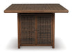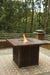| Details | Accommodates up to 8; bar stools sold separately, Door conceals gas propane tank (not included), Rust-proof aluminum frame with wood-look tabletop, Side panels accented with all-weather, handwoven resin wicker, 56" square fire pit table with CSA-approved 55,000 BTU stainless steel burner, glass beads, burner cover and enclosed storage area with shelves, Battery-operated ignition system with adjustable flame control; battery included, Convertible to natural gas, Gas line or propane tank connector hose not provided, Assembly required, Comes with protective weather cover | |
