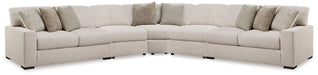 | Details | Includes 5 pieces: left-arm facing loveseat, 2 armless chairs, wedge and right-arm facing loveseat, "Left-arm" and "right-arm" describe the position of the arm when you face the piece, Corner-blocked frame, Loose reversible seat and back cushions, High-density foam cushions wrapped in feather-fiber blend jacket, Accent pillows included, Pillows with feather-fiber blend, Polyester upholstery, Exposed legs with faux wood finish, Platform foundation system resists sagging 3x better than spring system after 20,000 testing cycles by providing more even support, Smooth platform foundation maintains tight, wrinkle-free look without dips or sags that can occur over time with sinuous spring foundations | |