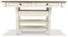 | Details | Made of veneers, wood and engineered wood, Two-tone textural finish; antique white with weathered oak finished top, 4 drawers; 2 each on each side, Storage rack holds up to 7 wine bottles, Seats up to 6, Assembly required | |
