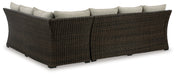 Details Includes sofa sectional and bench, All-weather resin wicker handwoven over rust-free aluminum frame with durable powder coated finish, Solution-dyed high-performance fabric, Nuvella+™ is an outdoor fabric that can be cleaned and offers enhanced UV resistance, Clean fabric with mild soap and water, let air dry; for stubborn stains, use a solution of 4 oz. bleach to 28 oz. water, Stainless steel hardware, Designed to withstand the harsh elements of the outdoors, Throw pillows included, Assembly required