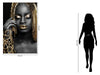 Immerse yourself in the striking elegance of "Woman Gold Hair," a contemporary photographic wall art piece printed on durable tempered glass. This artwork captures a powerful portrait of a woman adorned with shimmering gold accents on her lips, eyes, and headpiece, creating a captivating contrast against a deep black background. Hand-embellished details beneath the glass add a sleek, dimensional finish that enhances the visual depth and shine. Ready to hang with sawtooth hangers, this piece brings a sophisticated and modern touch to living rooms or offices while supporting a meaningful cause by donating a meal to a hungry child with each purchase.