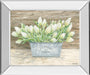 Step into a tranquil garden scene with this exquisite framed wall art featuring a delicate bouquet of white tulips nestled in a rustic metal container. The artwork captures the soft hues of green leaves and creamy petals against a weathered wooden background, evoking a sense of peaceful countryside charm. Encased in a sleek mirrored frame, the piece adds a subtle modern touch that enhances its timeless botanical appeal. Protected by premium real glass, the intricate details and gentle colors remain vivid and clear, making it a perfect addition to living rooms, bedrooms, or offices seeking a blend of traditional elegance and natural beauty.