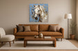 “White Horse on Blue” is a captivating hand-painted oil canvas that brings the serene beauty of a noble white horse to your living space. The contemporary style blends soft beige and blue tones with textured brushstrokes, creating depth and movement that draws you in. Framed in a champagne silver finish, this piece arrives ready to display, adding a touch of elegance and warmth to any living room, bedroom, or office. Each purchase supports a social cause, donating a meal to a hungry child, making this artwork not only a stunning décor choice but also a meaningful one.
