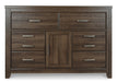 Get the look of posh barn wood without setting foot in a salvage yard. Replicated rough-sawn oak of this dresser has a vintage finish that is reminiscent of a timeworn family heirloom. Warm, rustic and naturally beautiful, it’s just got that ageless appeal. Sleek, mod pulls in a pewter tone are a snappy finishing touch.