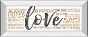 Celebrate the enduring power of love with this beautifully crafted framed wall art. The design features inspiring words that emphasize patience, kindness, hope, trust, and perseverance, creating a warm and uplifting atmosphere in any space. Encased in a sleek 2.5-inch mirrored frame, the piece reflects light and adds a modern touch of elegance. Protected by premium real glass, the vibrant typography and subtle woodgrain background remain vivid and pristine over time. Perfectly sized for living rooms, bedrooms, or offices, this meaningful artwork invites positivity and thoughtful reflection wherever it hangs.