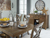 This dining room extension table elevates the art of casual rustic style. Clean-lined, farmhouse profile is beautified with a distressed nutmeg finish and thick planked effect top for added charm. And with not one but two drop-in leaves, you can easily accommodate eight with plenty of elbow room.