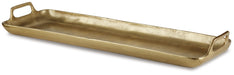 This tray was made for serving up superb style. Goldtone finished cast aluminum sets a sturdy foundation. This is the perfect fashionable piece for quickly adding versatility to your home.