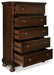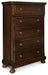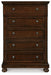 Details Made with select oak veneer, engineered wood, solid wood components and cast resin components, Antiqued white finish with grain texture, Dark bronze-tone knobs, 5 smooth-gliding drawers with dovetail construction with metal ball bearing side glides, Upper drawer with felt bottom